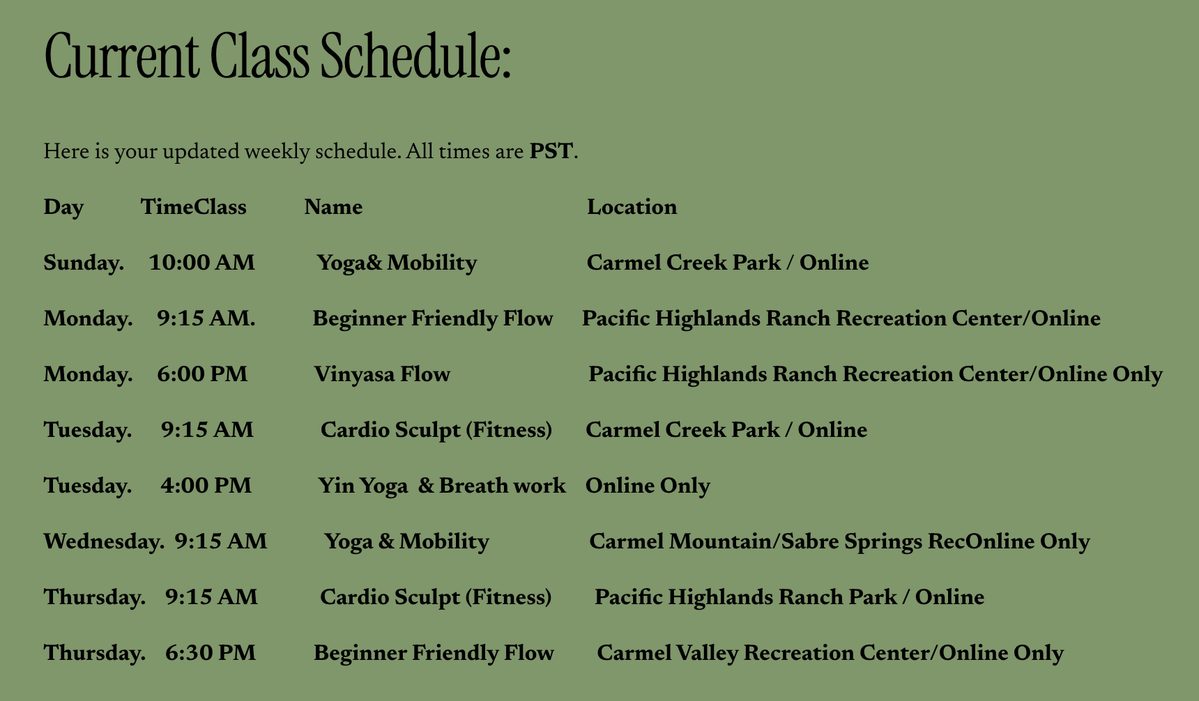 Participate in person at the Carmel Valley, Pacific Highlands Ranch, and the Carmel Mountain Recreation Center Classes.